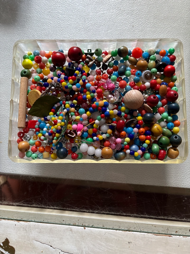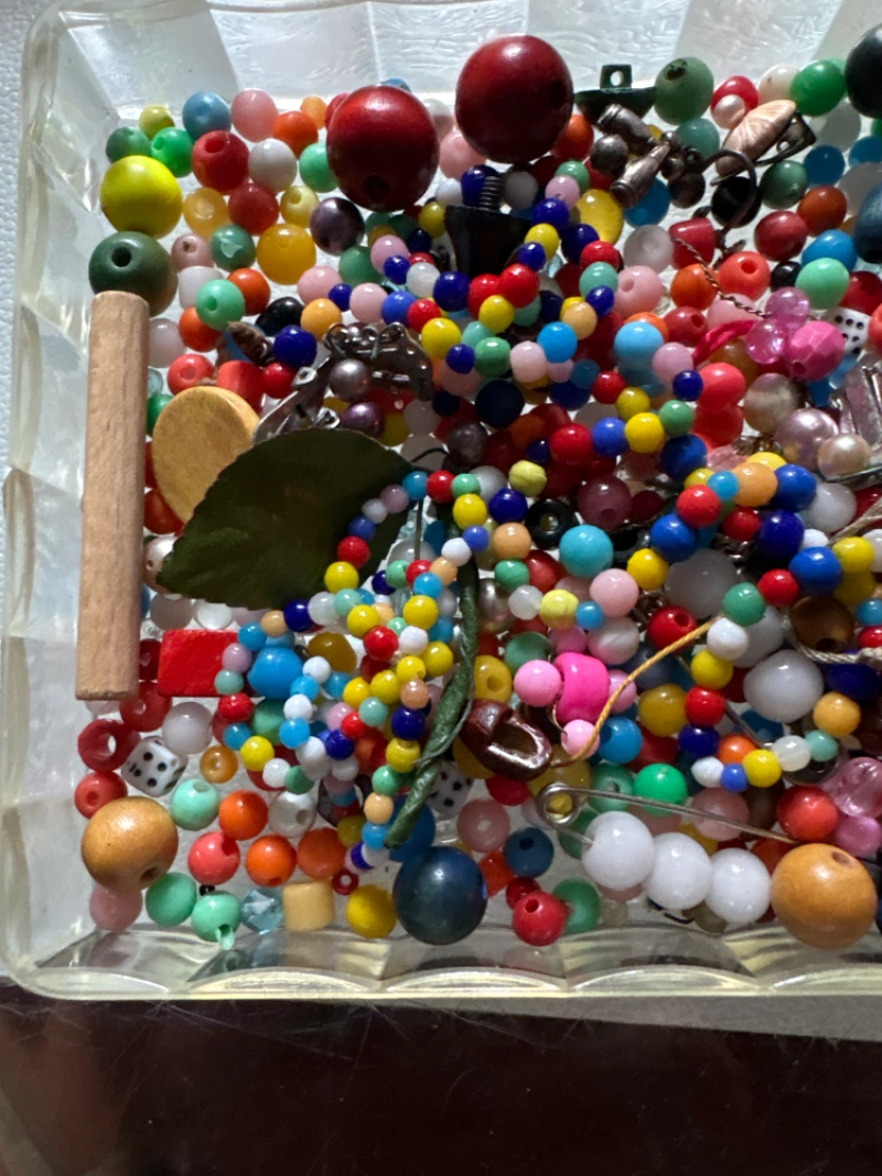 Une boîte avec tout un petit bazar de perles multicolores en verre en plastique en bois - très ancien - pour avoir une idée la boîte fait 16,5 x 14 cm X 2 cm environ - 3 photos