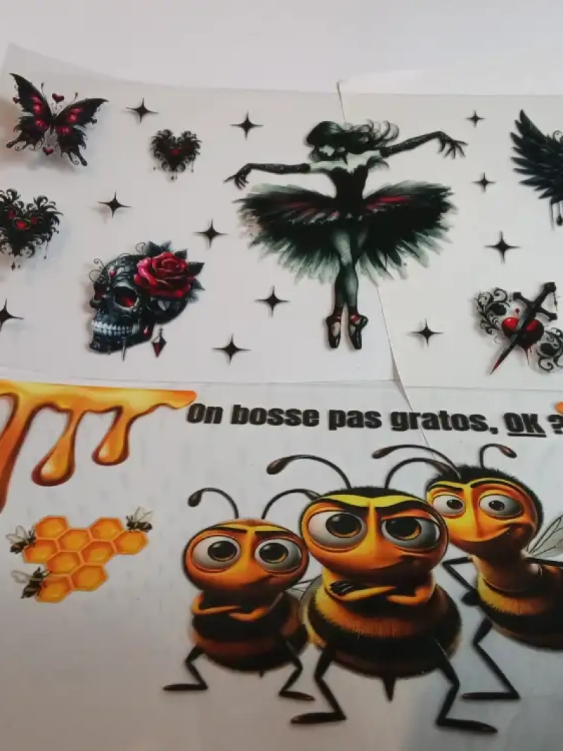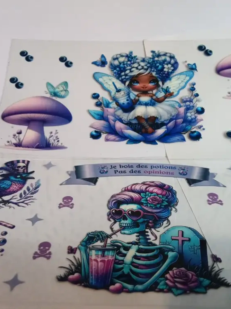 Lot de 10 stickers uvdtf imprimé recto verso idéal pour les gobelets 16 OZ ou peuvent être découpé pour s'adapter à vos créations. Une fois posés ils ne bouge plus éviter le lave vaisselle et le micro onde.