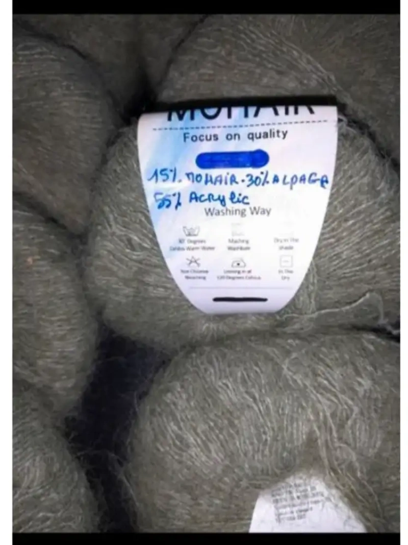 8 kaki, 120m et 25g chaque 15% Mohair, 30% Alpaga, 55% acrylic soit 200g et 960m