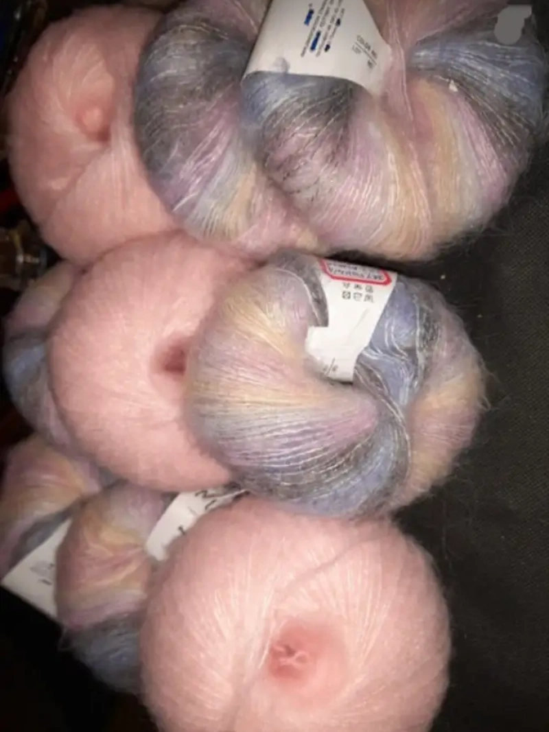 6 pelotes mix rose jaune bleu gris 160m et 25g chaque, 38% mohair, 29% alpaga, 33% laine soit 960m et 150g...aig 2/2,5-3